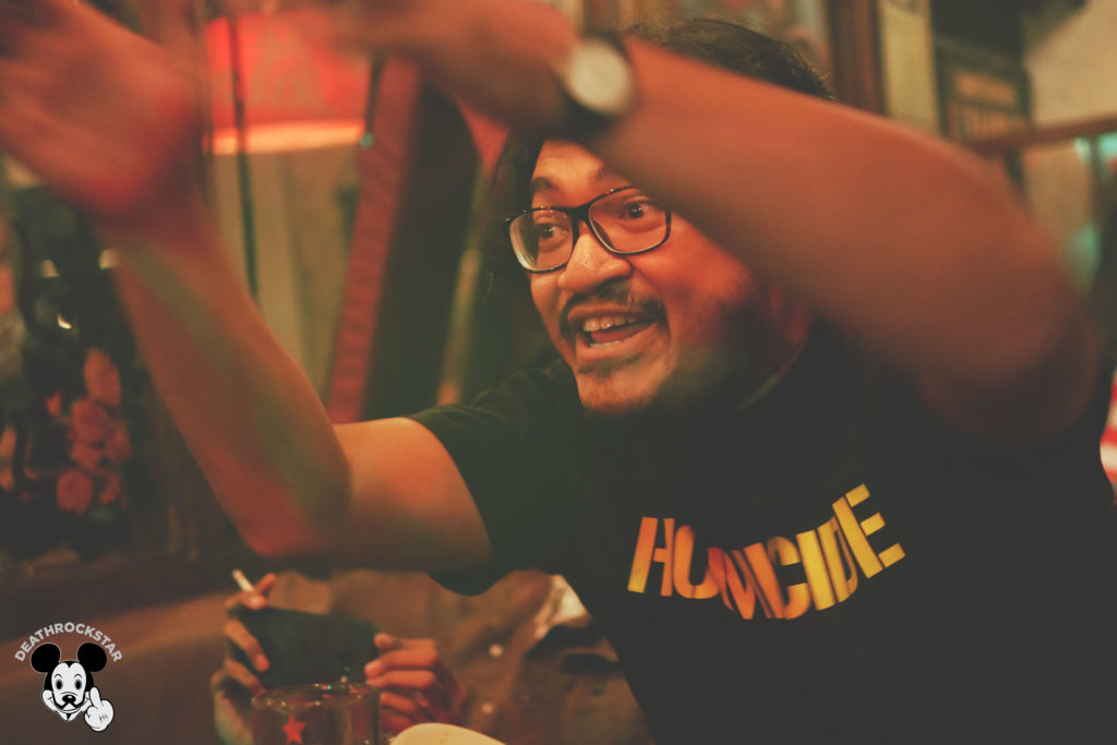 Setelah menukar tiket dengan segelas bir, saya mulai berbincang dengan beberapa teman, dan akhirnya memilih untuk duduk di meja yang diisi oleh personel dan krew Bottlesmoker. Karena sudah lama ngga ngobrol, dan posisi meja mereka relatif strategis untuk mendokumentasikan acara tanpa banyak gangguan. Walau sudut pandangnya dari samping saja.
