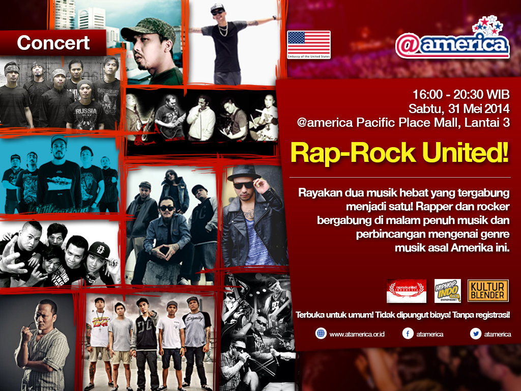 @RAPROCK_UNITED CONCERT Sabtu 31 Mei, 16.00 – 20.30 WIB AtAmerica, Pacific Place Mall Jakarta Menampilkan kolaborasi : Ballistic, Los Chalados, Fajar ‘Ibel’, Young Lexx, Ragajimesin, Master Wu, Kripikpeudeus, Tujuh Kurcaci,
