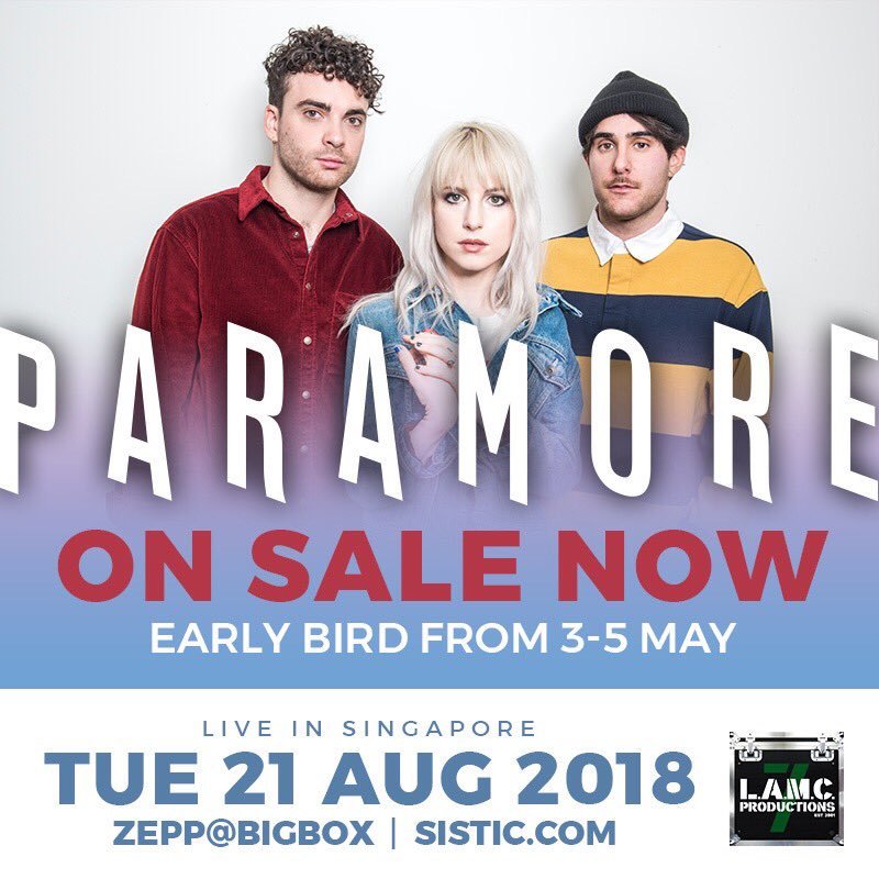 Paramore live in Singapore • 21 August May 3, 2018 · eric Paramore live in Singapore Tuesday, 21 August 2018 • Zepp@Bigbox Tickets available at www.sistic.comRead More